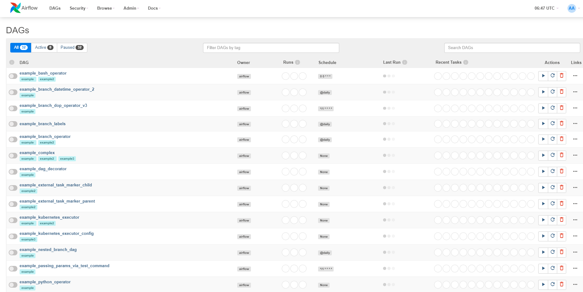 일반적으로 Airflow 의 상태를 확인하는 가장 좋은 방법은, 일단 전체를 다 설치하고, 각각의 Dag 에 들어가서 전체 layout을 확인하고, task 의 log 나 instance 그리고 status 등을 확인하는 게 가장 좋은 방법이다.