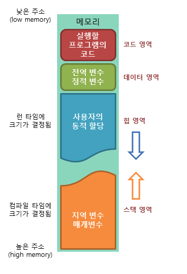 스택 영역: 지역변수나 매개변수가 저장된다.