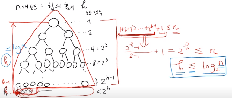 # 최악의 경우 가장 작은 값이 루트에 있을 경우임 이는 높이만큼 반복하게 됨