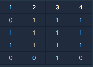 [[0,1,1,1],[1,1,1,1],[1,1,1,1],[0,0,1,0]] 9